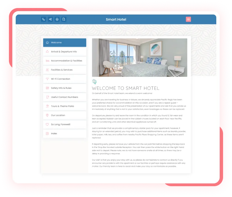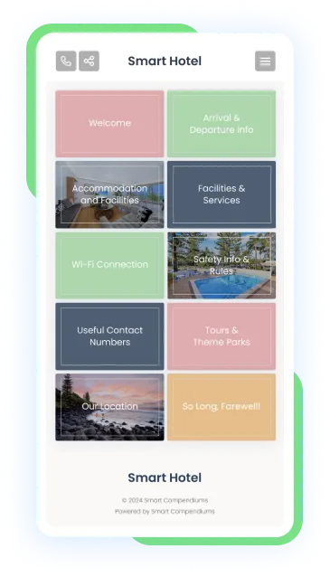 Effortlessly create and manage digital guidebooks with Smart Compendiums – no downloads required. Guests can access information seamlessly by simply clicking the shared link or QR code.