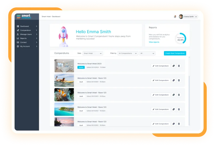 Our hotel's experience has been transformed by the digital compendiums provided by Smart Compendiums. Our guests love the convenience, and we've seen a significant increase in positive feedback. It's a game-changer for our hospitality!